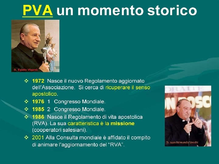 PVA un momento storico v 1876 Decreto di fondazione del primo Regolamento ufficiale della Pia Associazione. Don Bosco sottolinea il senso apostolico dell’Associazione. v 1914 -1963 -1972 Si affievolisce lo spirito apostolico dell’Associazione. v 1963 -65 Concilio Vaticano II chiede la revisione e la rivitalizzazione dello spirito originale di tutte le Istituzioni della Chiesa.