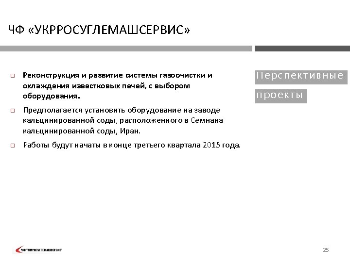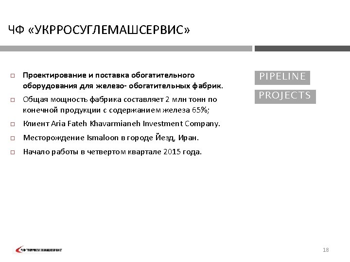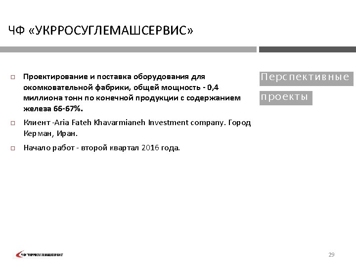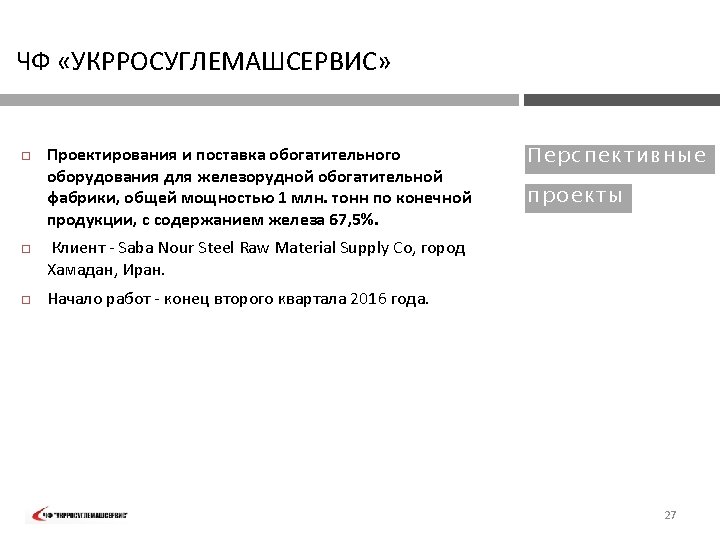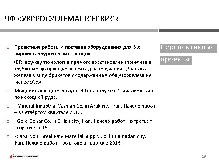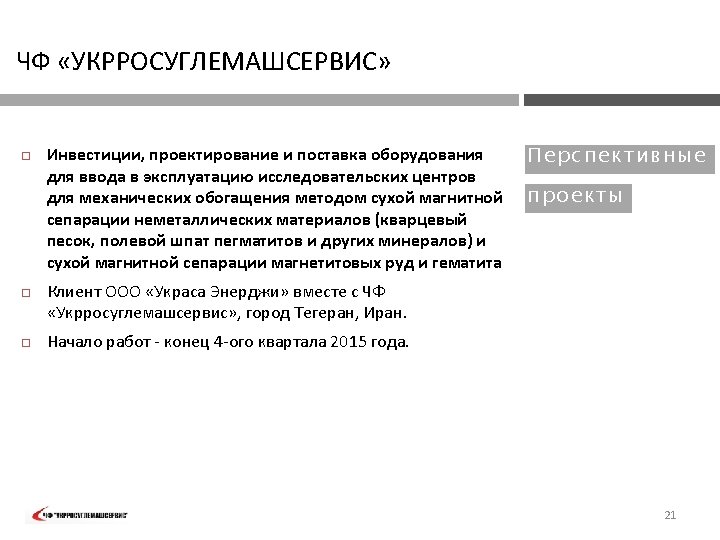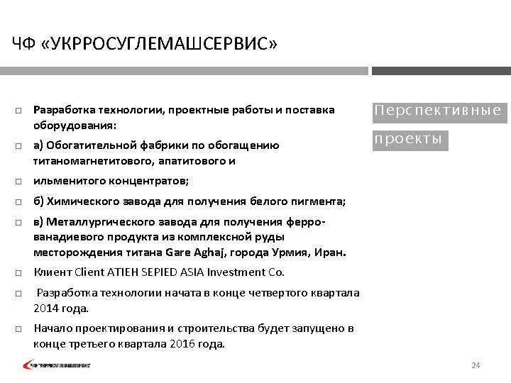 PVT „UKRROSUGLEMASHSERVIS“ FIELD OF Exploration and manufacturing technology development, mine planning and processing plant design – Iran 2006: EXPER TI SE : ORE PROCE SSI N G TECHN OLOGY performed exploration of titanomagnetite deposit, developed technology and desing of ilmenite concentrate processing plant, performed development of technology and design of a plant for obtaining titanium slag from ilmenite concentrates, performed development and design of a plant for obtaining pigments from titanium slag, supplied equipment for ilmenite concentrate processing plant, for plant for obtaining titanium slag and plant for obtaining pigments. The company involved experts from the following R&D institutions of Ukraine: KP „Kirovgeologiya„ Kiev; OJSC "Krivbassproekt" , Krivoy Rog; Min. DIP , Sumy; Institute of titanium, Zaporozhye. 6