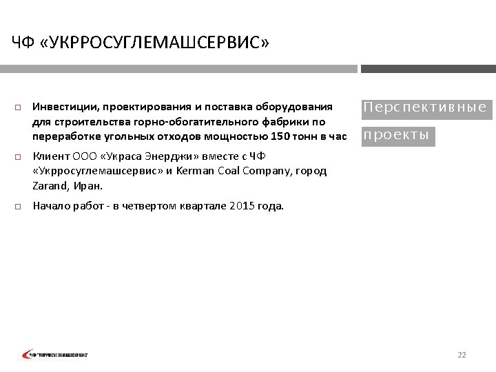 About us Contact: PVT „UKRROSUGLEMASHSERVIS“ 37, Mashinostroitelnaya Str. , Kiev 03067, Ukraine T. : +38(044) 351 -11 -11 F. : +38(044) 351 -18 -52 Cell: +38(050) 328 -46 -23 E-Mail: root@mashserv. donetsk. ua www. mashserv. donetsk. ua Код ОКПО 20377008 Bank account 26003010050703 ОАО ВТБ Банк, Kиев, Украина, MФО 321767 PVT „UKRROSUGLEMASHSERVIS“ is being delivering mining and processing equipment since 1994. Numerous projects were performed in Ukraine, Russia, Romania, Slovakia, Iran, Turkey and other countries. Close collaboration with leading scientific organisations of Ukraine and other countires. The company was awared with „Vienna Cup“ of European Union in nomination „ Company of XXI century“ for introducing effective management skills in production. 3