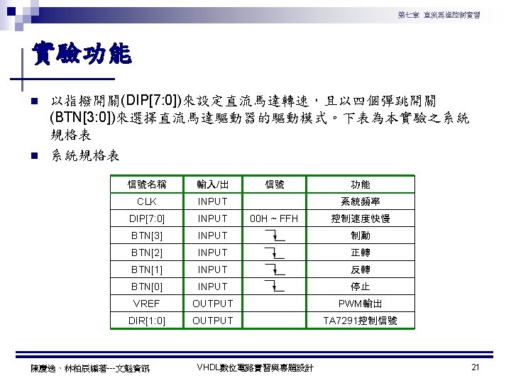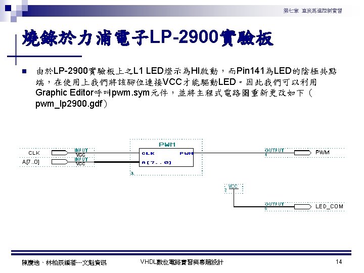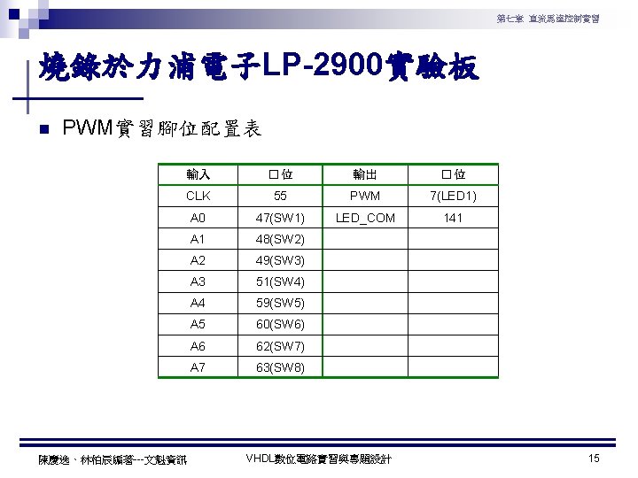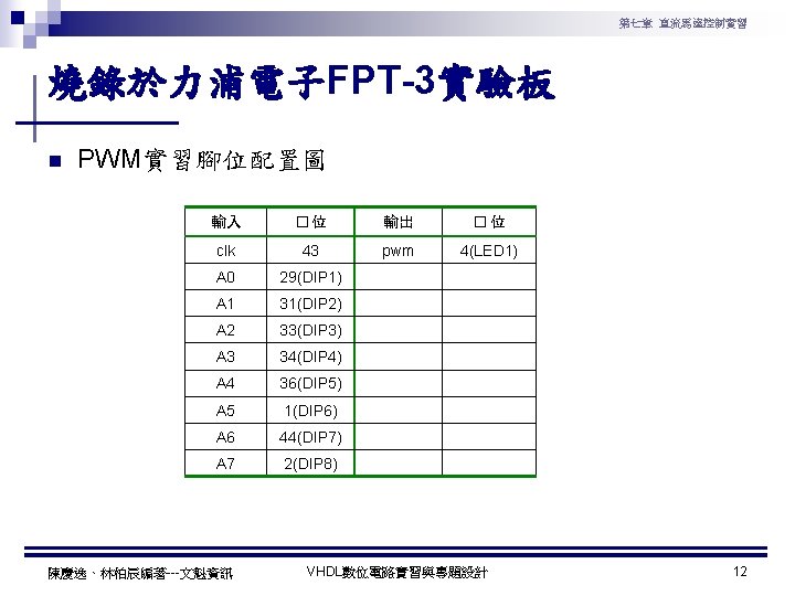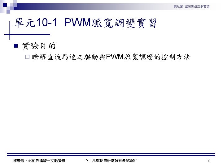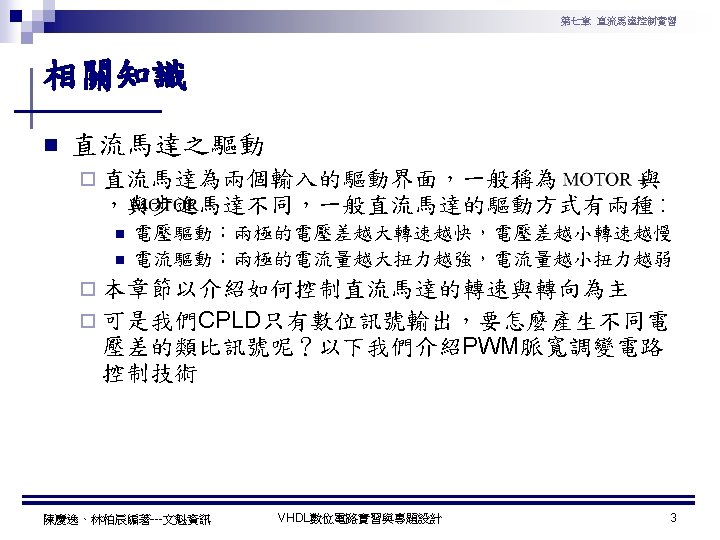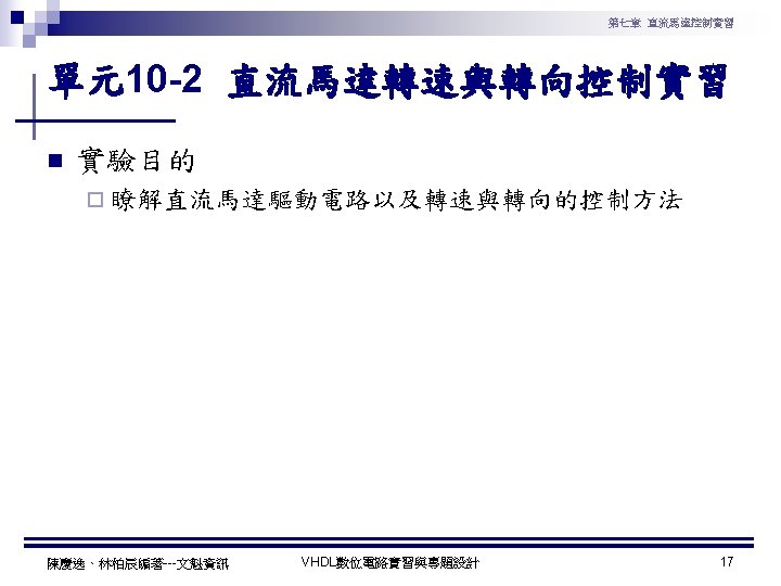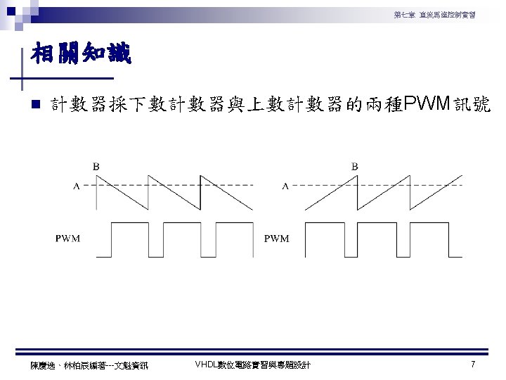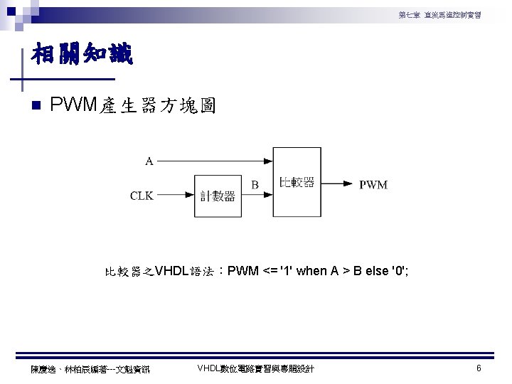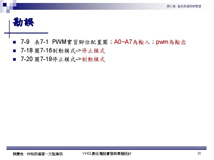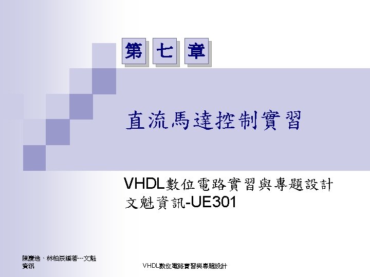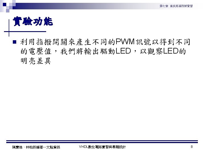 第七章 直流馬達控制實習 PWM實習程式碼 1 ---------------------------------2 --實驗名稱:PWM實習 3 --檔案名稱:pwm. vhd 4 --功 能:以指撥開關來調整PWM訊號輸出 5 --日 期: 2003. 8. 8 6 ---------------------------------7 library ieee; 8 use ieee. std_logic_1164. all; 9 use ieee. std_logic_arith. all; 10 use ieee. std_logic_unsigned. all; 11 12 entity pwm is 13 port( 14 clk : in std_logic; --系統頻率 15 A : in std_logic_vector(7 downto 0); 16 pwm : out std_logic 17 ); 18 end pwm; 19 20 architecture a of pwm is 陳慶逸、林柏辰編著---文魁資訊 21 signal B: std_logic_vector(7 downto 0); 22 begin 23 24 ----- 下數計數器 ----25 process(clk) 26 begin 27 if clk'event and clk='1' then 28 B <= B-1; 29 end if; 30 end process; 31 32 ----- 比較器 ----33 pwm<='1' when A > B else '0'; 34 end a; VHDL數位電路實習與專題設計 10