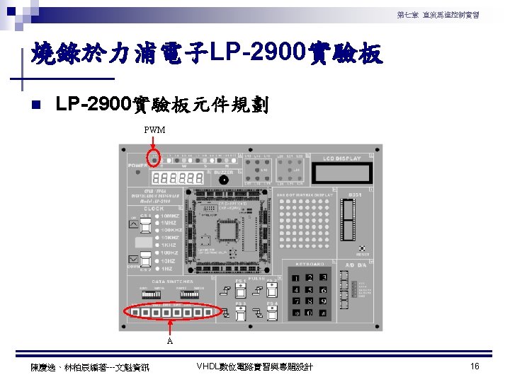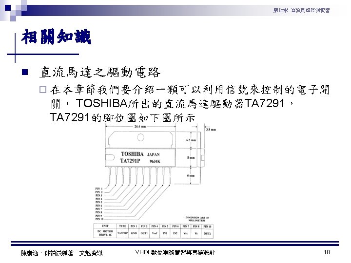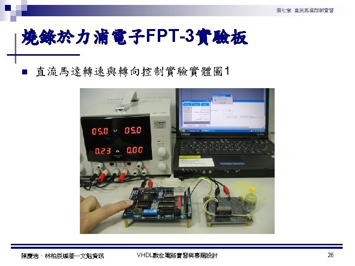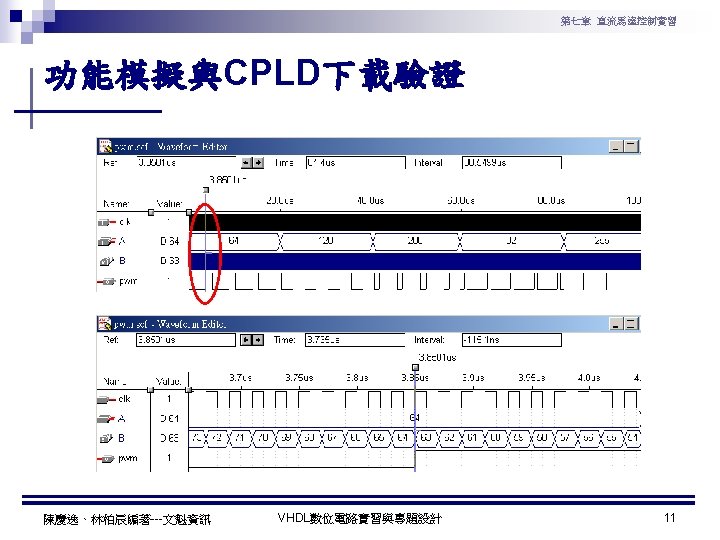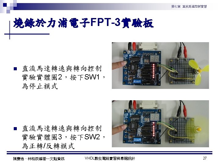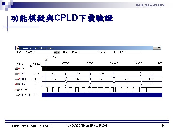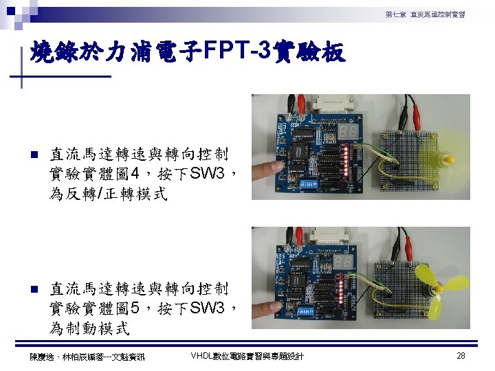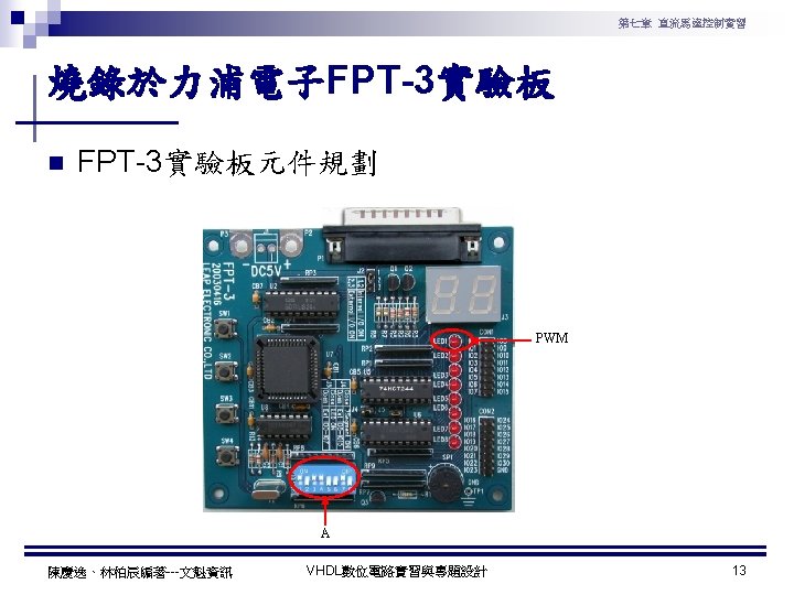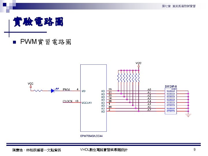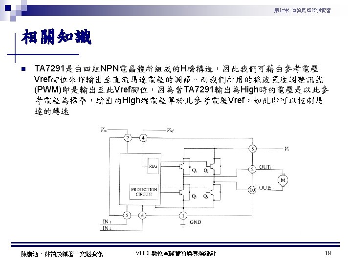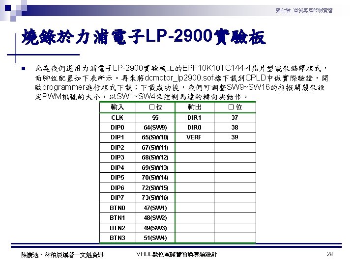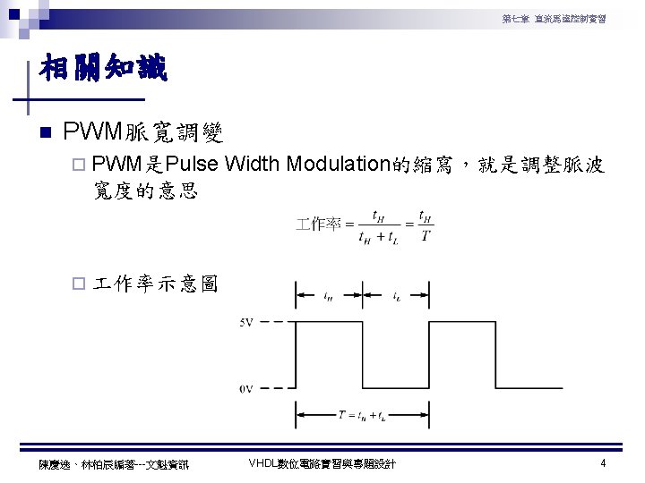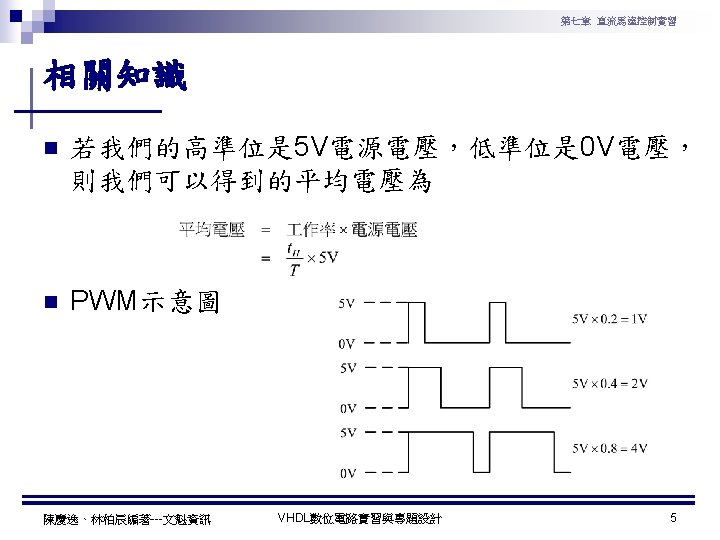 第七章 直流馬達控制實習 PWM實習程式碼 1 ---------------------------------2 --實驗名稱:PWM實習 3 --檔案名稱:pwm. vhd 4 --功 能:以指撥開關來調整PWM訊號輸出 5 --日 期: 2003. 8. 8 6 ---------------------------------7 library ieee; 8 use ieee. std_logic_1164. all; 9 use ieee. std_logic_arith. all; 10 use ieee. std_logic_unsigned. all; 11 12 entity pwm is 13 port( 14 clk : in std_logic; --系統頻率 15 A : in std_logic_vector(7 downto 0); 16 pwm : out std_logic 17 ); 18 end pwm; 19 20 architecture a of pwm is 陳慶逸、林柏辰編著---文魁資訊 21 signal B: std_logic_vector(7 downto 0); 22 begin 23 24 ----- 下數計數器 ----25 process(clk) 26 begin 27 if clk'event and clk='1' then 28 B <= B-1; 29 end if; 30 end process; 31 32 ----- 比較器 ----33 pwm<='1' when A > B else '0'; 34 end a; VHDL數位電路實習與專題設計 10