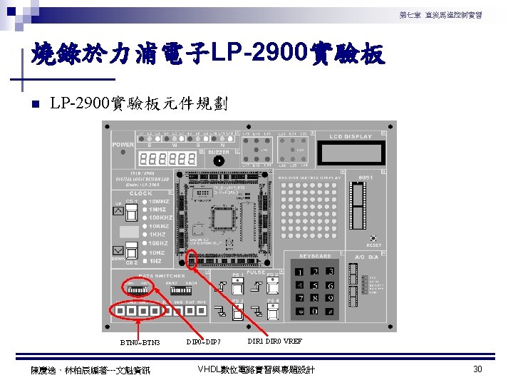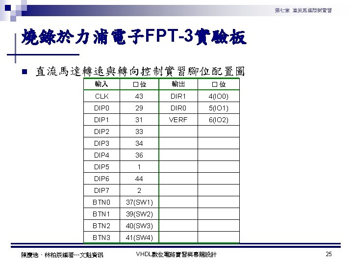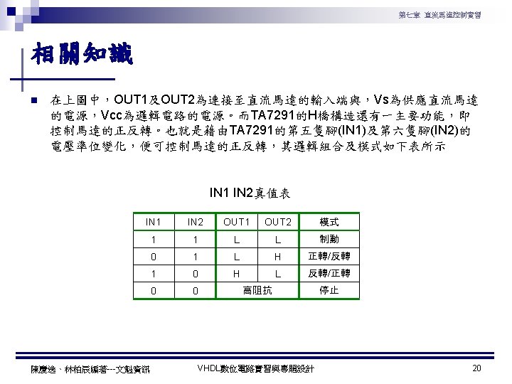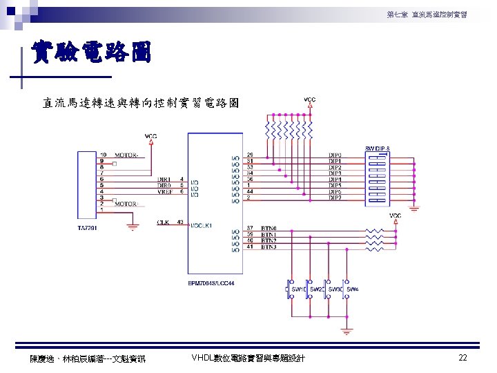 第七章 直流馬達控制實習 直流馬達轉速與轉向控制實習程式碼 1 ---------------------------------2 --實驗名稱:直流馬達轉速與轉向控制實習 3 --檔案名稱:dcmotor. vhd 4 --功 能:以指撥開關來調整直流馬達轉速, 以彈跳開關控制直流馬達轉向 5 --日 期: 2003. 8. 8 6 ---------------------------------7 library ieee; 8 use ieee. std_logic_1164. all; 9 use ieee. std_logic_arith. all; 10 use ieee. std_logic_unsigned. all; 11 12 ntity dcmotor is 13 ort( 14 clk : in std_logic; -- 系統頻率 15 DIP : in std_logic_vector(7 downto 0); --指撥開關輸入 16 BTN : in std_logic_vector(3 downto 0); --彈跳開關輸入 17 VREF : out std_logic; --PWM 訊號 18 DIR : out std_logic_vector(1 downto 0) --TA 7291模式選擇訊號 19 ); 20 end dcmotor; 21 22 architecture a of dcmotor is 23 signal B: std_logic_vector(7 downto 0); 24 begin 陳慶逸、林柏辰編著---文魁資訊 VHDL數位電路實習與專題設計 25 26 ----- 下數計數器 ----27 process(clk) 28 begin 29 if clk'event and clk='1' then 30 B <= B-1; 31 end if; 32 end process; 33 34 ----- 比較器 ----35 VREF <= '1' when DIP > B else '0'; 36 37 ----- TA 7291模式選擇 ----38 process(BTN) 39 begin 40 case BTN is 41 when "1110" => DIR <= "00"; 42 when "1101" => DIR <= "01"; 43 when "1011" => DIR <= "10"; 44 when "0111" => DIR <= "11"; 45 when others => DIR <= "00"; 46 end case; 47 end process; 48 end a; 23