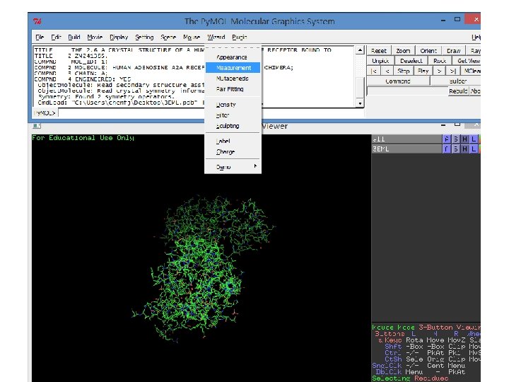 打开文件 Using the External GUI Menu – The default external GUI provides a standard Open. . . item in the File menu which you can use to select the file you wish to open. • Using Commands – SYNTAX • load <filename> – EXAMPLE • load test/dat/pept. pdb