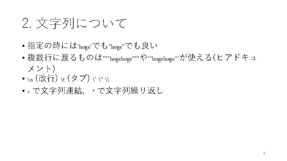 2. 型変換 >>> a = 3 >>> print(str(a)) >>> b = 4. 8 '3' >>> c = 10 e 4 >>> print(str(b)) '4. 8' >>> print(b)) >>> print(str(c)) 4 '10000' >>> print(c)) 10000 >>> print(float(a)) 3. 0 8