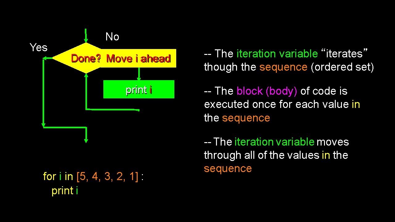 Yes No Done? Move i ahead print i for i in [5, 4, 3, 2, 1] : print i -- The iteration variable “iterates” though the sequence (ordered set) -- The block (body) of code is executed once for each value in the sequence -- The iteration variable moves through all of the values in the sequence