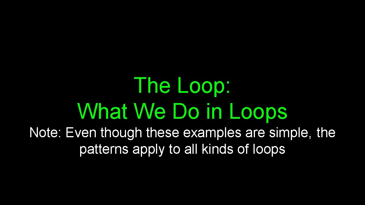 The Loop: What We Do in Loops Note: Even though these examples are simple, the patterns apply to all kinds of loops