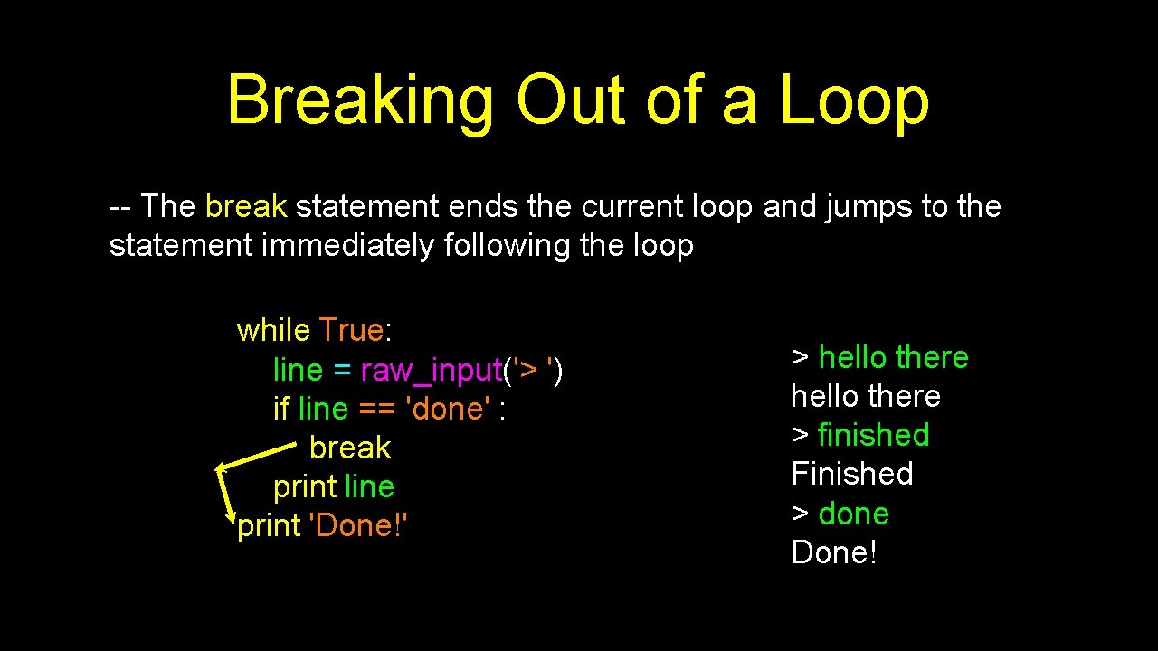 Breaking Out of a Loop -- The break statement ends the current loop and jumps to the statement immediately following the loop while True: line = raw_input('> ') if line == 'done' : break print line print 'Done!' > hello there > finished > done Done!