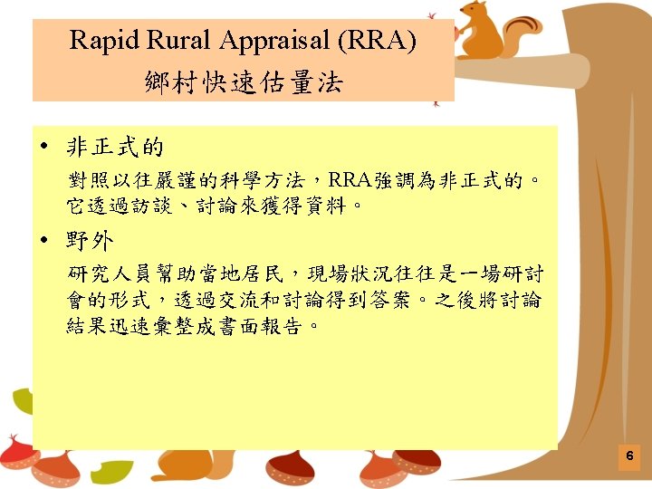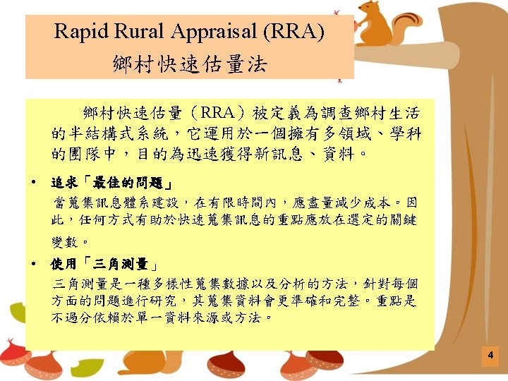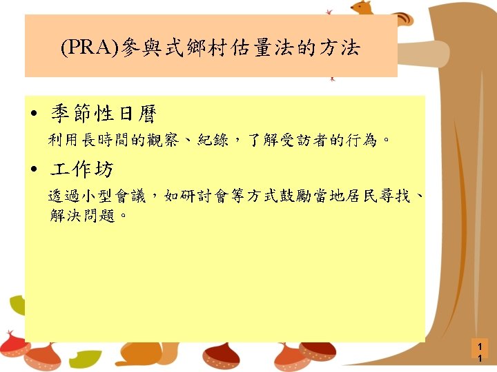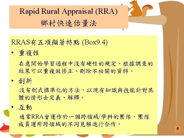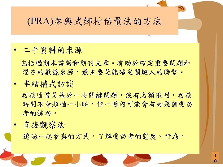 RRA與PRA RRA Period of major development 主要發展時期 Late 1970 s, 1980 s 70年代末,80年代 Late 1980 s, 1990 s 80年代末,90年代 Major innovators based in 總部主要設於 Universities 大學 NGOs 非營利組織 Main users at first 主要使用者(適用對象) Aid agencies, universities 援助機構,大學 NGOs, government field organizations 非政府組織,政府外地組織 Key resource earlier Undervalued 早期評估的重要資源 Local people’s knowledge 當地居民的知識 Local people’s analytical capabilities 當地居民的分析能力 Main innovations 主要的創新 Methods, team management 方法,團隊管理 Behavior, experiential training 行為,體驗式培訓 Predominant mode 主要模式 Elicitive, extractive 發掘 Facilitating, participatory 促進、參與 Ideal objectives 理想目標 學習外來資訊 Empowerment of local people 賦權/培育給當地居民 Longer-term outcomes 較長期的結果 Plans, project publications 計劃、出版物 Sustainable local action and institutions 可持續的地方行動和組織 8