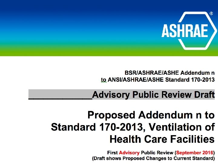 ASHRAE 170 • Follows the FGI Guidelines move to separate hospital, outpatient and residential requirements • Outpatient section is available for comment • 45 -day public review from September 16, 2016 to October 31, 2016 • The intent is not to create new outpatient requirements http: //www. ashrae. org/standards-research-technology/public-review-drafts