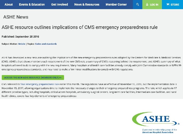 CMS Adoption of the 2012 Life Safety Code® and Health Facilities Code, Video produced by ASHE http: //www. ashe. org/education/webinars/201606 -changes-cop. shtml