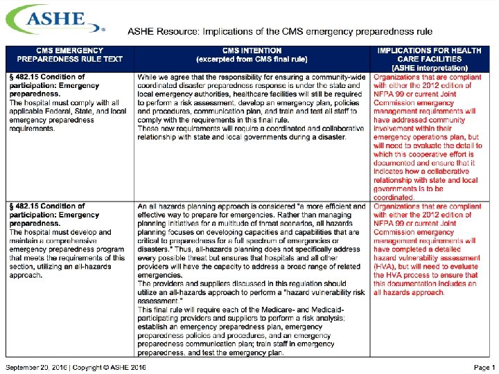 Major implications If you are Joint Commission accredited or comply with NFPA 99 EM requirements: • 28% of CMS requirements are met • 35% of CMS requirements – evaluate your policies and plans to be sure of compliance • 37% of CMS requirements could require relocating existing information or adding new