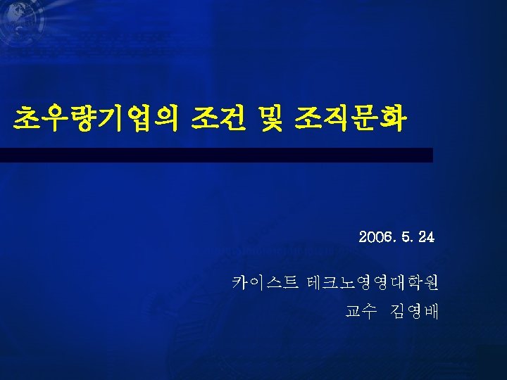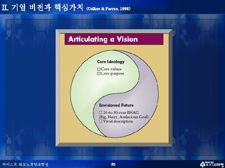 II. 기업 비전과 핵심가치 n n n 기업 비전: 장수기업이 되기 위한 조건 (Built to Last, 1994) § 기업의 핵심본질 (Core ideology) 과 미래모습(envisioned future)으로 구성 § 기업과 구성원의 행동 지침을 제공하고 강력한 동기부여를 제공 기업의 핵심 본질 (Core ideology) § Core value: 변하지 않는 기업의 원칙과 기본이 되는 사상 § Core purpose: 기업의 궁극적인 존재 이유 미래의 모습 (Envisioned Future) § BHAG (Big, Hairy, Audacious Goal): 10 - 30년 미래의 모습에 대한 목표 ― Target BHAGs: Become a $125 Billion company by the year 2000 ― Common-enemy BHAGs: Beat Xerox or Crush Adidas ― Role-model BHAGs: Become a Harvard of the West ― Internal-transformation BHAGs: Become a #1 or #2, and combine the strengths of a big company and agility of a small company § Vivid description: ― 구성원들이 Passion, emotion, conviction을 갖도록 명료하게 기술해야 ― Send a man to moon (NASA in 1960 s) 카이스트 테크노경영대학원 21