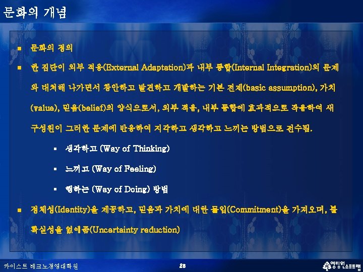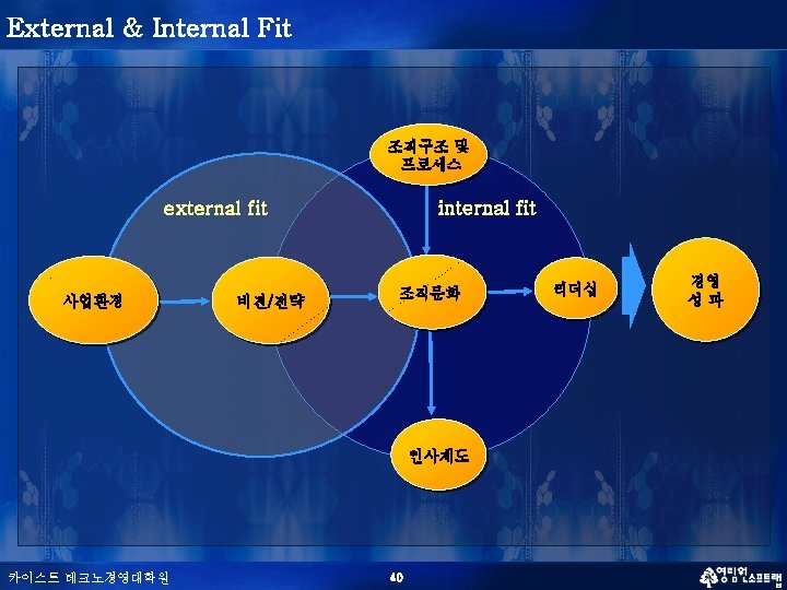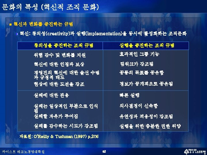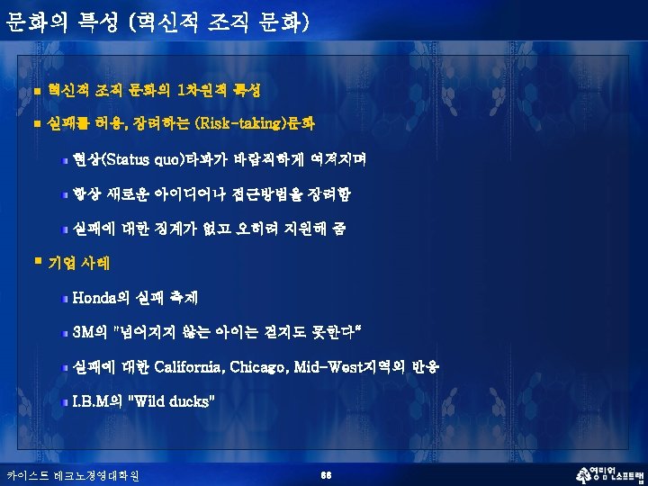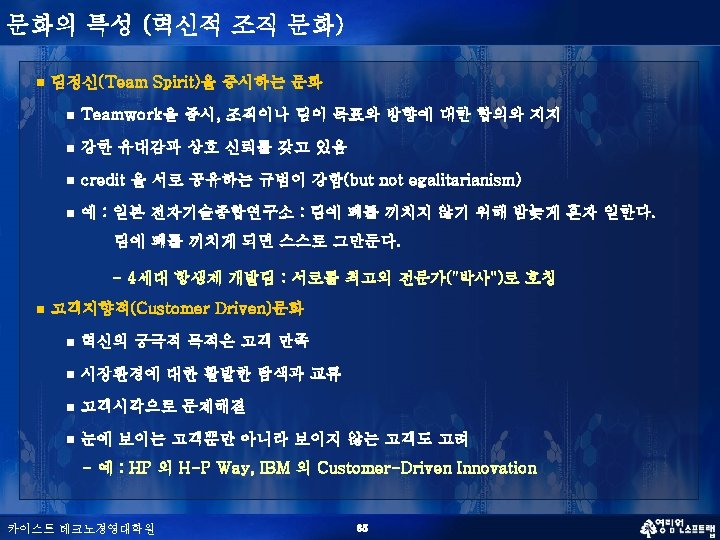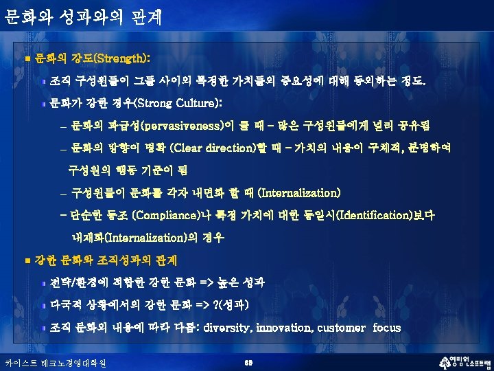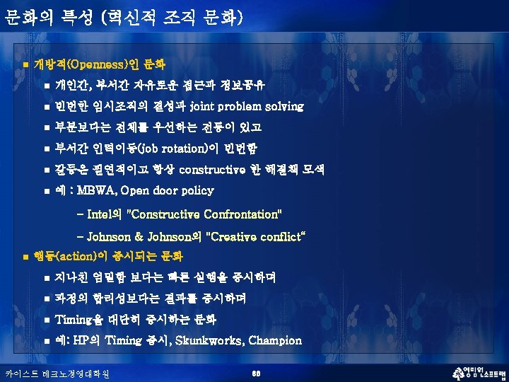 문화의 특성 (혁신적 조직 문화) n n 혁신적 조직 문화의 다차원적 특성 (Creative Tension) n Creative Freedom vs Control n Differentiation vs Integration n Individualism vs Collectivism n Localism vs Professionalism n Contemplation vs Action 서로 모순되는 가치관을 타협(Compromising)하는 것이 아니라 융합(Synthesizing) 하는 것이 창조적인 문화 카이스트 테크노경영대학원 37
