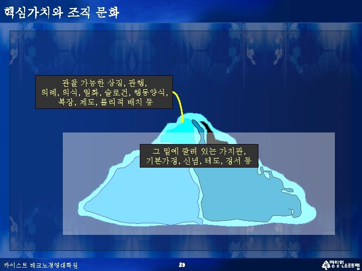 [HP] 핵심가치 n HP는 Carly Fiorina의 취임 후 “New HP Way”를 만들어 나가기 위하여 다음과 같이 핵심가치를 조정 Current Value (New HP Way) # of Values Old Value 1 Passion for customers 2 Trust & respect Trust and Respect for the Individual 3 Achievement & Contribution Achievement and Contribution 4 Uncompromising Integrity 5 Teamwork 6 Meaningful innovation Flexibility & Innovation 7 Speed & agility 카이스트 테크노경영대학원 비고 신규로 추가 변경 신규로 추가 11