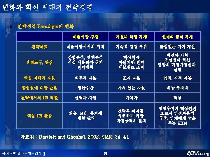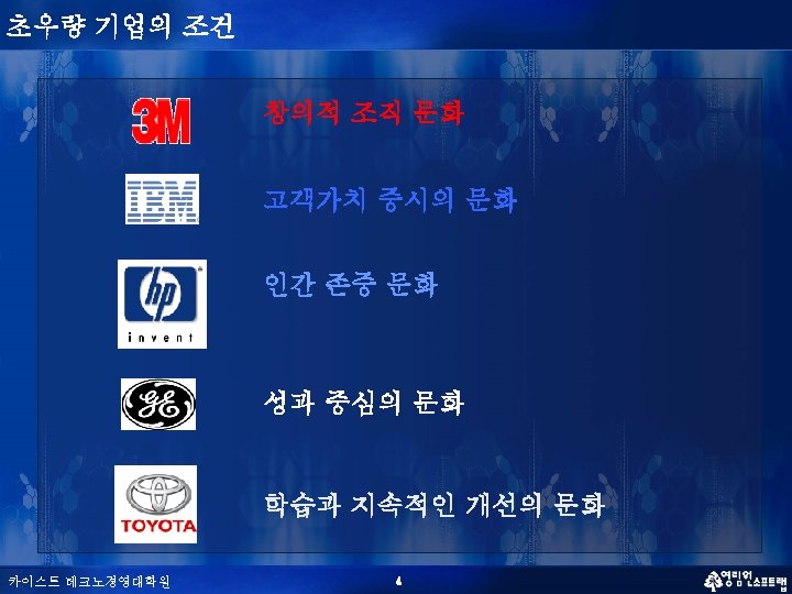 초우량 기업의 조건 q 지속적 경쟁우위의 원천(Sources of sustainable competitive advantage: Barney, 1991) - VRIO (Something Valuable, Rare, Inimitable, and Organizationally-embedded) q BSC (Balanced Score Card) Model (Kaplan & Norton, 1992) 재무적 성과 고객만족 / 가치제공 경영 프로세스 역량; 비용, 품질, 스피드 핵심역량 학습 카이스트 테크노경영대학원 3