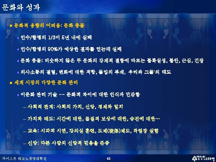 인적 자본을 통한 성공적 기업의 7가지 속성 Percent of IPO’s S Surviving After Five Years Probability of an Initial Public Offering Firm’s Surviving Five Years 87. 0 % 79. 0 % 60. 0 % 45. 0 % Value Placed on Human Resources Rewards Used One standard deviation above the mean 카이스트 테크노경영대학원 One standard deviation below the mean 60