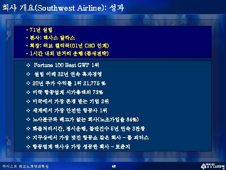 Southwest Airline Mission n The Mission of Southwest Airlines The mission of Southwest Airlines is dedication to the highest quality of Customer Service delivered with a sense of warmth, friendliness, individual pride, and Company Spirit. n To Our Employees We are committed to provide our Employees a stable work environment with equal opportunity for learning and personal growth. Creativity and innovation are encouraged for improving the effectiveness of Southwest Airlines. Above all, Employees will be provided the same concern, respect, and caring attitude within the organization that they are expected to share externally with every Southwest Customer. 카이스트 테크노경영대학원 49