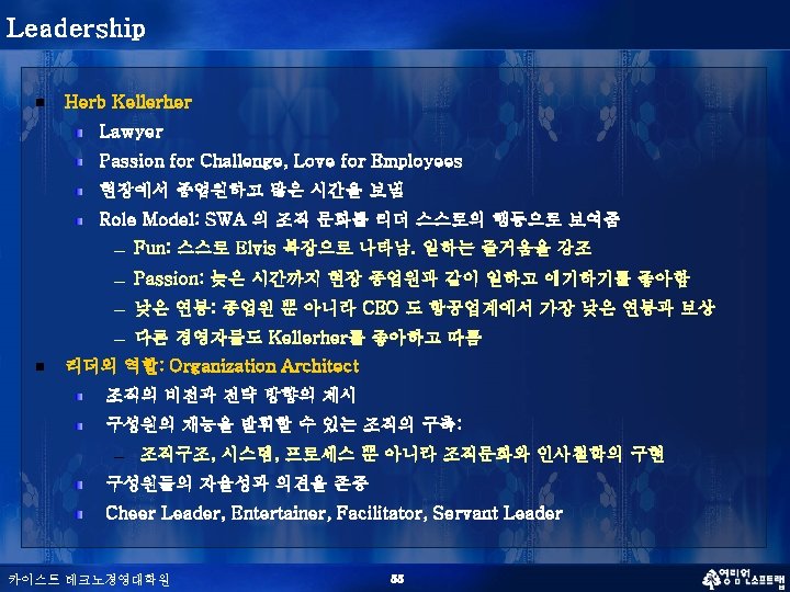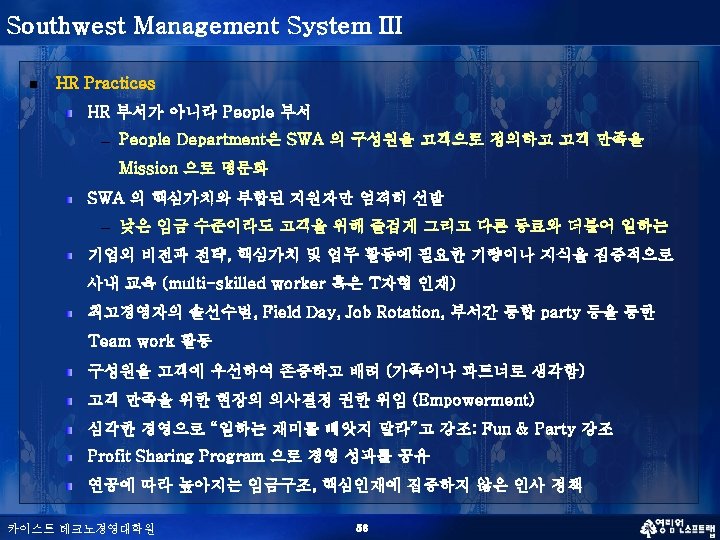 SWA 조직 문화 n Customer service n Hard work & Dedication n Efficiency n Egalitarian or Community Culture n Teamwork n Fun & Trust for People 카이스트 테크노경영대학원 54