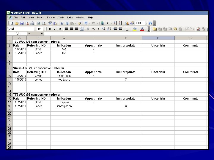 Appropriate Use Criteria (AUC) Mandatory requirement for accreditation effective January 1, 2012 Appropriate use must be measured in a minimum of 30 consecutive TTE, 30 consecutive TEE and 30 consecutive Stress patients annually ACCF/ASE/ACEP/ASNC/SCAI/SCCT/SCMR 2007 Appropriateness Criteria for Transthoracic and Transesophageal Echocardiography Percentage of appropriate, inappropriate and uncertain indications for testing must be measured