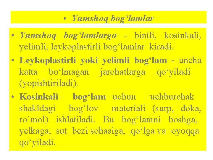 • Yumshoq bog‘lamlarga - bintli, kosinkali, yelimli, leykoplastirli bog‘lamlar kiradi. • Leykoplastirli yoki yelimli bog‘lam - uncha katta bo‘lmagan jarohatlarga qo‘yiladi (yopishtiriladi). • Kosinkali bog‘lam uchun uchburchak shakldagi bog‘lov materiali (surp, doka, ro`mol) ishlatiladi. Bu bog‘lamni boshga, yelkaga, sut bezi sohasiga, qo‘lga va oyoqqa qo‘yiladi.