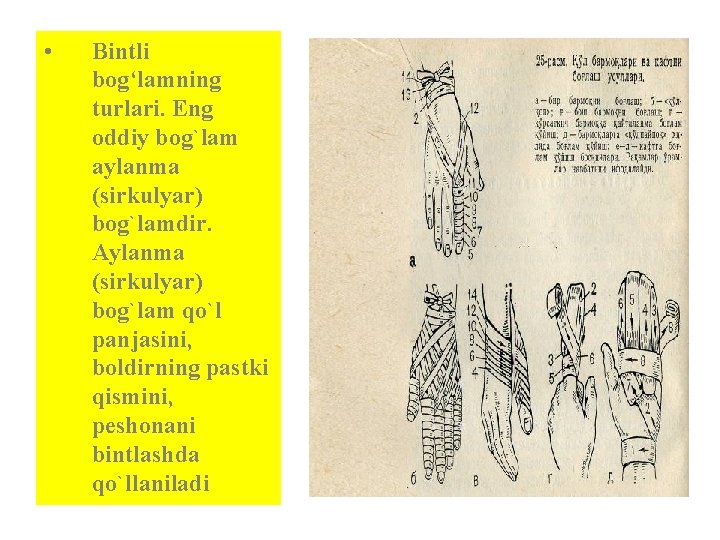 • Bintli bog‘lamning turlari. Eng oddiy bog`lam aylanma (sirkulyar) bog`lamdir. Aylanma (sirkulyar) bog`lam qo`l panjasini, boldirning pastki qismini, peshonani bintlashda qo`llaniladi