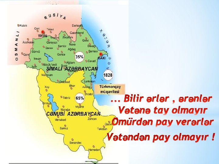 Azərbaycan ərazisində XIII əsrdən etibarən xanlıqlar yaranmağa başladı. Güclü dövlətçilik ənələrinə malik olan xanlıqların olmasına baxmayaraq onların arasında birlik yox idi. Buna görə də Rusiya və İran dövlətlərinin təcavüzünə məruz qaldılar. Rusiya və İran vətənimizin torpaqlarını yağlı tikə kimi ikiyə bölmüş, Azərbaycanın ürəyinə Araz boyda şırım açmışlar.