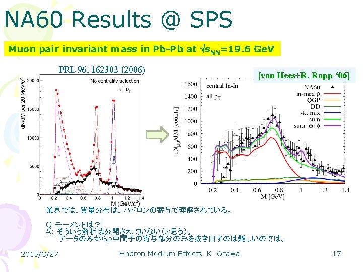 多くの測定が試みられた • High energy heavy ion collisions – SPS-NA 60 (PRL 96 (2006) 162302) • Modification of r meson due to hadronic effects – RHIC-PHENIX (PRC 81(2010) 034911) • Origin of the enhancement is under discussion • Nuclear targets – HADES (G. Agakishiev et al. Eur. Phys. J. A 48 64 (2012). ) • Enhancement in low mass region – CBELSA/TAPS (Phys. Rev. C 82 (2010) 035209) • Modification of w is not observed – J-LAB CLAS G 7 (PRL 99 (2007) 262302) • Mass broadening of r due to hadronic effects – KEK-PS E 325 (PRL 96 (2006) 092301) • Peak shift and width broadening of r/w 2015/3/27 Hadron Medium Effects, K. Ozawa 16
