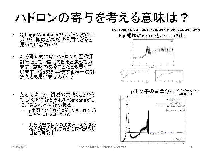 次に、r/w と f を比較してみる • r/w – Dynamical mass contribution is dominant Mp ~ 130 Me. V/c 2 Mr ~ 770 Me. V/c 2 – Large hadronic effects and background issues are large • f – Still, dynamical mass contribution is dominant Mh ~ 550 Me. V/c 2 Mf ~ 1020 Me. V/c 2 – Narrow width ( 4. 3 Me. V/c 2) • Small background issue – Small effects of hadron-hadron interactions • e. g. Binding energy of f. N is 1. 8 Me. V (Phys. Rev. C 63(2001) 022201 R) 浅川さんに聞こう!! 2015/3/27 Hadron Medium Effects, K. Ozawa 20