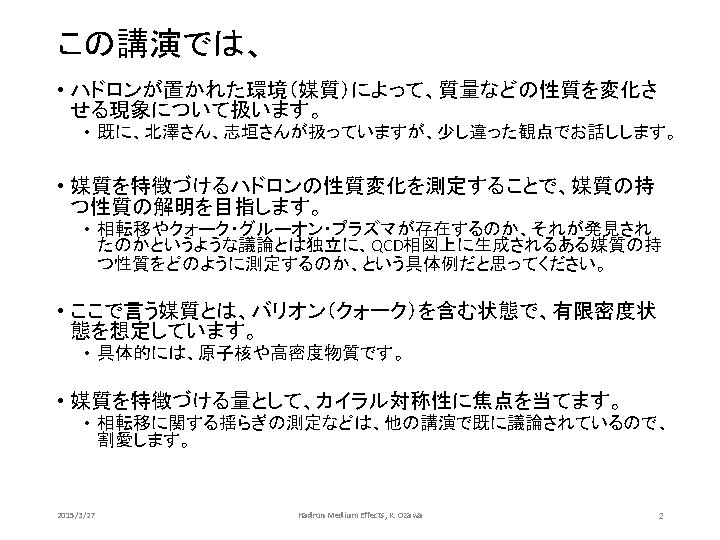 反応過程の理解の重要性:pAにおいても • Difference is significant R. S. Hayano and T. Hatsuda, Ann. Rev. • What can cause the difference? • Different production process • Peak shift caused by phase space effects in p. A? • Need spectral function of r without nuclear matter effects Note: CLAS KEK • similar momentum range • E 325 can go lower slightly We need to have a new experiment to investigate the problem. 2015/3/27 Hadron Medium Effects, K. Ozawa 34