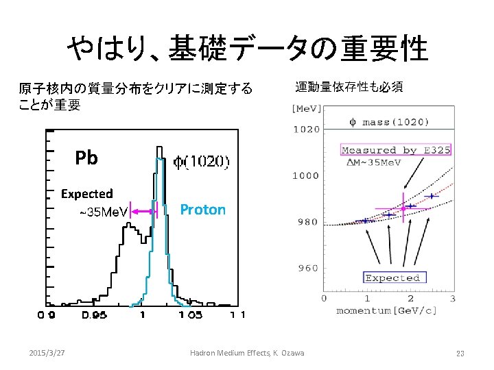 Next step Evaluate quark condensate. Average of Imaginary part of P(w 2) Replace by average of measured spectra Assumed Spectrum p Then, calculate quark condensate using QCD sum rule. Experimental requirements 2015/3/27 1. High statics 2. Good mass resolution Hadron Medium Effects, K. Ozawa 22
