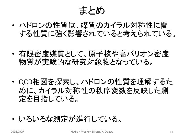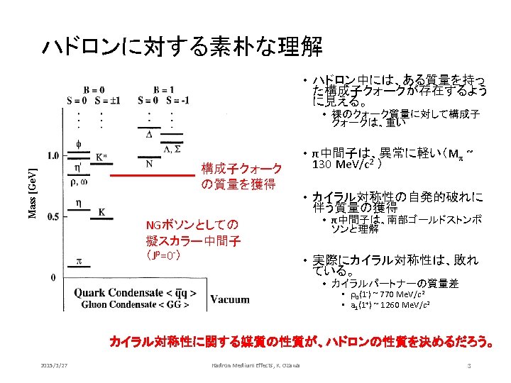 QCD Lagrangian Chiral symmetry Gluon Divide with quark chirality mass Neglect (if m ~0) V(q) The lagrangian does not change under the transformation below. This symmetry is called Chiral symmetry. 2015/3/27 Hadron Medium Effects, K. Ozawa Symmetric in rotation q 4