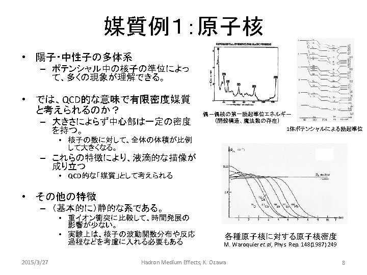 QCD medium QCD: Quantum Chromo Dynamics Temperature T K. Fukushima and T. Hatsuda, Rep. Prog. Phys. 74 (2011) 014001 g in ak re B y al r i Ch tr e m ym 高バリオン密度物質 S 原子核 Free Space 実験的にアクセス出来そうな領域 2015/3/27 Baryon Chemical Potential m. B Hadron Medium Effects, K. Ozawa 7