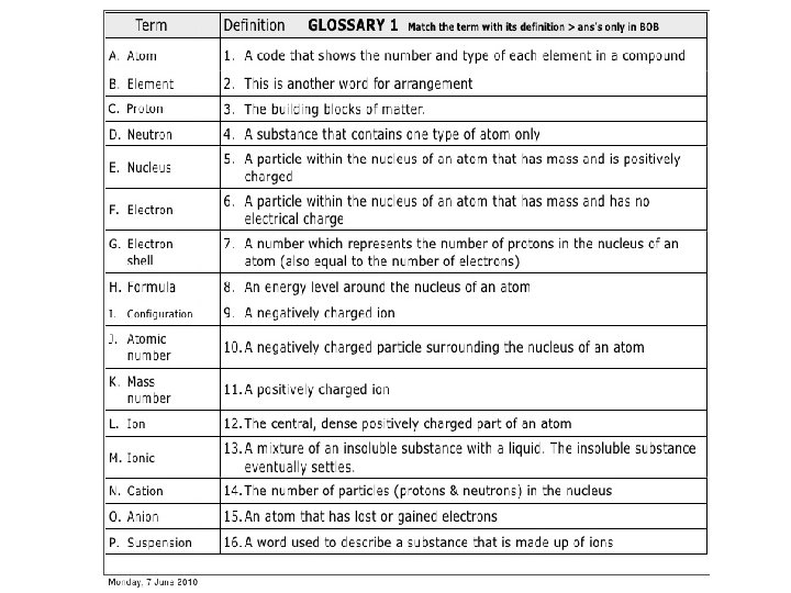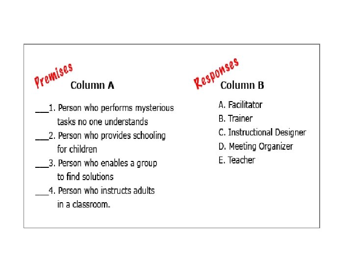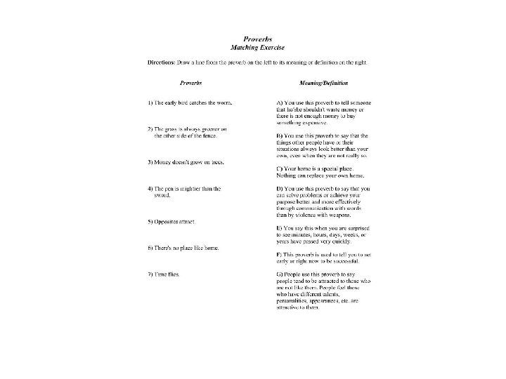 Step 3: • create a matching exercise ( including KEY ) • MATCHING EXERCISE: in this exercise you have to match each word with a definition • two items separated into two columns and ask them to match items from the first column to the corresponding items in the second • 8 -10 items (words+definitions) • the number of items in the first column does not necessarily have to match that in the second - it is totally possible to have more items in the second column than in the first one • it is best to arrange the items in the left column according to some criterion (alphabetically, chronologically, etc) • make sure that no items in the right column can be matched to more than one item in the left one • avoid positioning matching test questions in such a way that the list is separated in two by a page break • example: Finance terms or Finances •