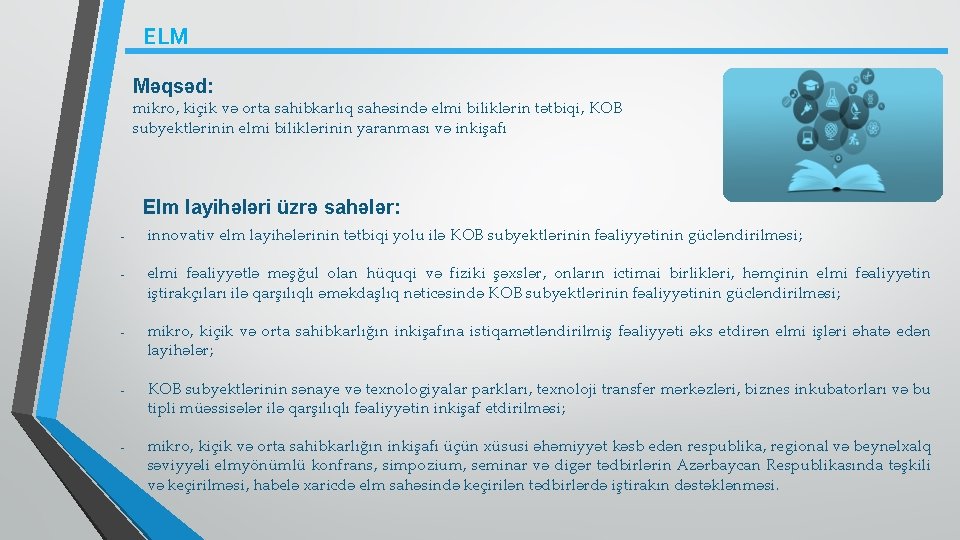 ELM Məqsəd: mikro, kiçik və orta sahibkarlıq sahəsində elmi biliklərin tətbiqi, KOB subyektlərinin elmi biliklərinin yaranması və inkişafı Elm layihələri üzrə sahələr: - - innovativ elm layihələrinin tətbiqi yolu ilə KOB subyektlərinin fəaliyyətinin gücləndirilməsi; elmi fəaliyyətlə məşğul olan hüquqi və fiziki şəxslər, onların ictimai birlikləri, həmçinin elmi fəaliyyətin iştirakçıları ilə qarşılıqlı əməkdaşlıq nəticəsində KOB subyektlərinin fəaliyyətinin gücləndirilməsi; mikro, kiçik və orta sahibkarlığın inkişafına istiqamətləndirilmiş fəaliyyəti əks etdirən elmi işləri əhatə edən layihələr; KOB subyektlərinin sənaye və texnologiyalar parkları, texnoloji transfer mərkəzləri, biznes inkubatorları və bu tipli müəssisələr ilə qarşılıqlı fəaliyyətin inkişaf etdirilməsi; mikro, kiçik və orta sahibkarlığın inkişafı üçün xüsusi əhəmiyyət kəsb edən respublika, regional və beynəlxalq səviyyəli elmyönümlü konfrans, simpozium, seminar və digər tədbirlərin Azərbaycan Respublikasında təşkili və keçirilməsi, habelə xaricdə elm sahəsində keçirilən tədbirlərdə iştirakın dəstəklənməsi.