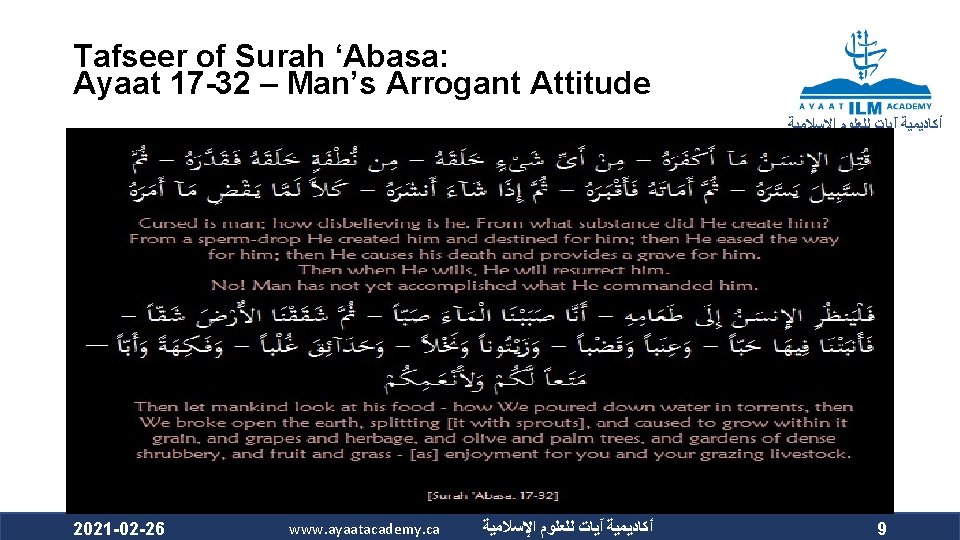 Tafseer of Surah ‘Abasa: Ayaat 1 -16 – The Basis of Social Values ﺃﻜﺎﺩﻳﻤﻴﺔ آﻴﺎﺕ ﻟﻠﻌﻠﻮﻡ ﺍﻹﺳﻼﻣﻴﺔ • Upon reading the opening words of this Surah one feels that in this Surah Allah has expressed His displeasure against the Prophet (pbuh) for his treating the blind man with indifference and attending to the big chiefs exclusively. But in reading the whole Surah objectively, one finds that the displeasure, in fact, is expressed against the disbelieving Qureysh, who, because of their arrogant attitude and indifference, were rejecting the message of truth with contempt. • “Do not. This is a Lesson. Whoever wills, shall remember it. On honorable pages. Exalted and purified. By the hands of scribes. Noble and devoted. ” • This chapter begins with an emphatic expression of negation and refusal. Kallā is used to convey a forceful disagreement with what was stated or implied previously. No, this cannot be so. In no way is it acceptable to favor certain people over others on account of their social standing, even when the objective is a noble one. Thus, a new moral ethic was established within the Muslim ummah. Respect and appreciation for people was now to be based upon faith and taqwā rather than worldly considerations. This was a huge social revolution. These verses serve as a reminder for whoever would remember the admonition, and whoever would remember Allah. The Qur’ān itself has been called a reminder, for it reminds man of his Lord, his purpose on earth and of the conduct he should adopt. • The Qur’ān's verses are recorded in al-lawḥ al-maḥfūth, a noble, elevated record containing pure and honored texts which have been kept secure from human interference and alteration. Another meaning conveyed by Ibn Katheer is that the verses are recorded in a Book containing honored sheets or pages, referring to the Qur’ān. "Exalted" means elevated in status, and "purified" means excluding the human additions and deletions found in previous scriptures. Safarah are ambassadors, those who travel to deliver communications, and refers to the noble and obedient messenger-angels who were entrusted with the revelation – to guard and deliver it precisely in order to rectify matters among mankind. 2021 -02 -26 www. ayaatacademy. ca ﺃﻜﺎﺩﻳﻤﻴﺔ آﻴﺎﺕ ﻟﻠﻌﻠﻮﻡ ﺍﻹﺳﻼﻣﻴﺔ 8