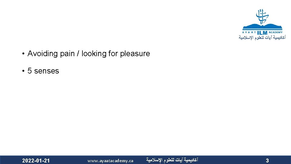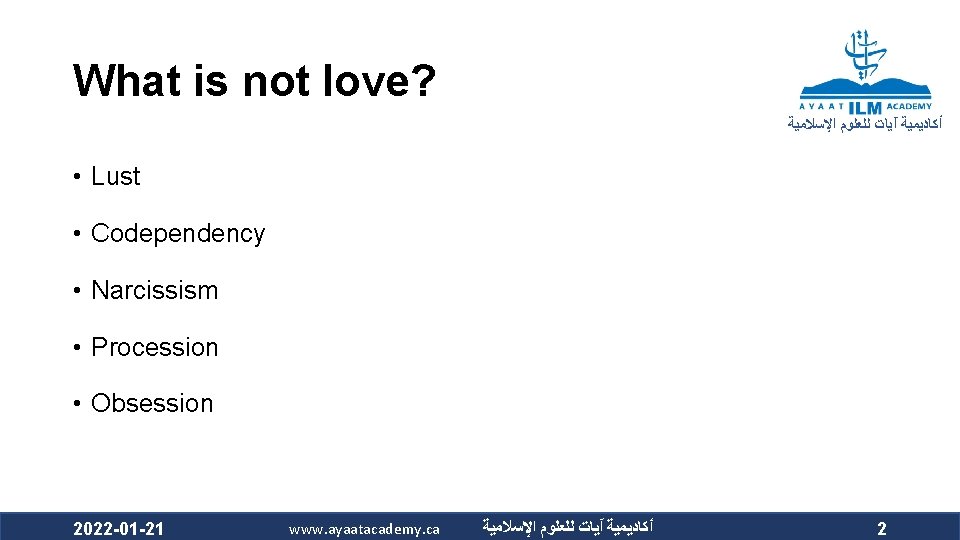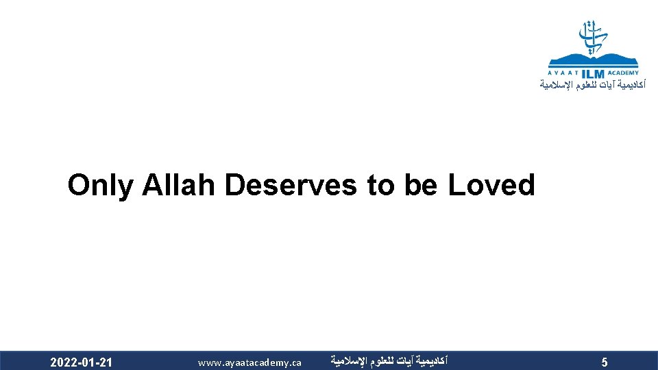 Causes of love ﺃﻜﺎﺩﻳﻤﻴﺔ آﻴﺎﺕ ﻟﻠﻌﻠﻮﻡ ﺍﻹﺳﻼﻣﻴﺔ · The love of the human being for existence, perfection, and survival. · The love of those are benevolent to him. Such benevolence contributes to his permanent existence, his survival and repels the dangers that he may be subjected to. · The love of those who are benevolent to people, even though they may not be benevolent to him. · The love of things that are beautiful in themselves, whether the beauty is an inner soul beauty or external physical beauty. · The love of those with whom there is a natural affinity 2022 -01 -21 www. ayaatacademy. ca ﺃﻜﺎﺩﻳﻤﻴﺔ آﻴﺎﺕ ﻟﻠﻌﻠﻮﻡ ﺍﻹﺳﻼﻣﻴﺔ 4