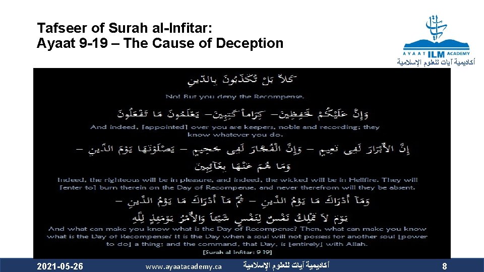 Tafseer Surah al-Infitar: Ayaat 1 -8 – O Mankind! What has made You Careless about Your Lord ﺃﻜﺎﺩﻳﻤﻴﺔ آﻴﺎﺕ ﻟﻠﻌﻠﻮﻡ ﺍﻹﺳﻼﻣﻴﺔ 2021 -05 -26 www. ayaatacademy. ca ﺃﻜﺎﺩﻳﻤﻴﺔ آﻴﺎﺕ ﻟﻠﻌﻠﻮﻡ ﺍﻹﺳﻼﻣﻴﺔ 4