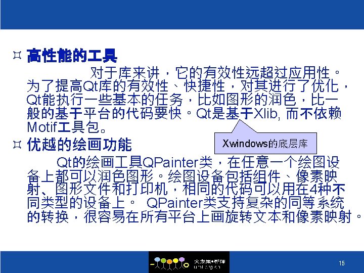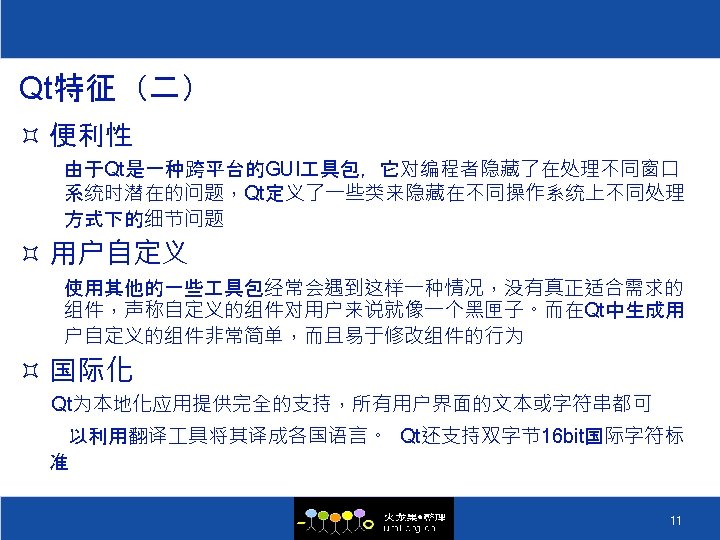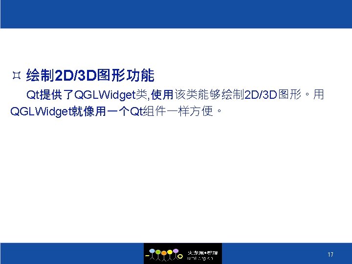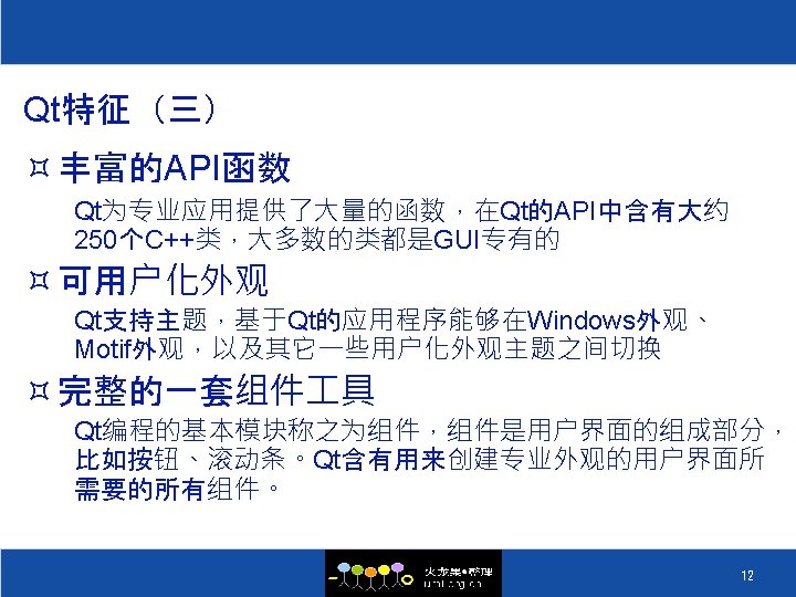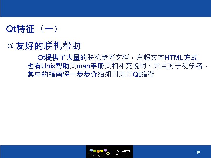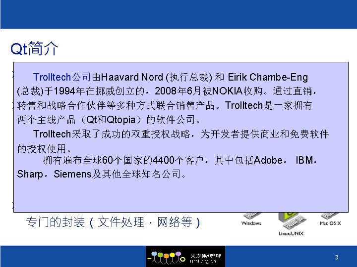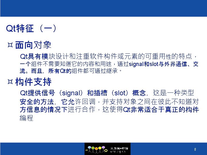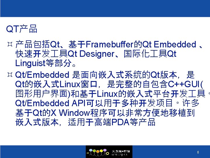 QT的历史 ² 1996 Sep 24 Qt 1. 0 ² 1996 Oct KDE 组织成立 ² 1998 Apr 05 Trolltech 的程序员在 5 天之内将 Netscape 5. 0 从 Motif 移植到 Qt 上 ² 1998 Apr 08 KDE Free Qt 基金会成立 ² 1998 Jul 12 KDE 1. 0 发布 ² 1999 Jun 25 Qt 2. 0 发布 ² 2000 Mar 20 嵌入式 Qt 发布 ² 2000 Sep 06 Qt 2. 2 发布 ² 2000 Sep 04 Qt free edition 开始使用 GPL ² 2004 Aug 4. 0 ² 2008 Aug 4. 4发布, 集成Webkit和Phonon 5