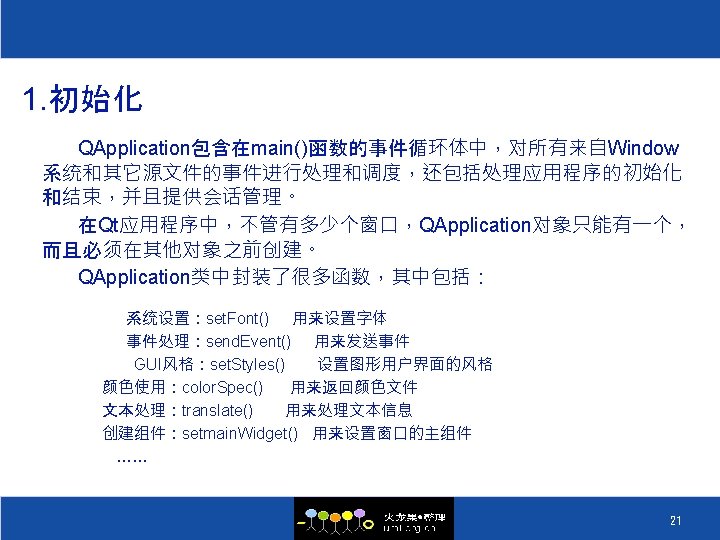 函数分组 系统设置 desktop. Settings. Aware()、set. Desktop. Settings. Aware()、cursor. Flash. Time()、set. Cursor. Flash. Time()、double. Click. Interval()、set. Double. Click. Interval()、 wheel. Scroll. Lines()、set. Wheel. Scroll. Lines()、palette()、set. Palette()、font()、set. Font()、font. Metrics()。 事件处理 exec()、process. Events()、enter_loop()、exit()、quit()。 send. Event()、post. Event()、send. Posted. Events()、remove. Posted. Events()、 has. Pending. Events()、notify()、mac. Event. Filter()、qws. Event. Filter()、x 11 Process. Event()、win. Event. Filter()。 图形用户 界面风格 style()、set. Style()、polish()。 颜色使用 color. Spec()、set. Color. Spec()、qws. Set. Custom. Colors()。 文本处理 set. Default. Codec()、install. Translator()、remove. Translator()、translate()。 窗口部件 main. Widget()、set. Main. Widget()、all. Widgets()、top. Level. Widgets()、desktop()、active. Popup. Widget()、active. Modal. Widget()、clipboard()、 focus. Widget()、win. Focus()、active. Window()、widget. At()。 高级光标处理 has. Global. Mouse. Tracking()、set. Global. Mouse. Tracking()、override. Cursor()、set. Override. Cursor()、restore. Override. Cursor()。 X窗口系统同步 flush. X()、sync. X()。 对话管理 is. Session. Restored()、session. Id()、commit. Data()、save. State()。 线程 lock()、unlock()、locked()、try. Lock()、wake. Up. Gui. Thread()。 杂项 close. All. Windows()、starting. Up()、closing. Down()、type()。 50