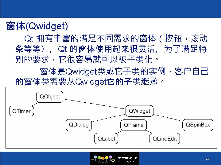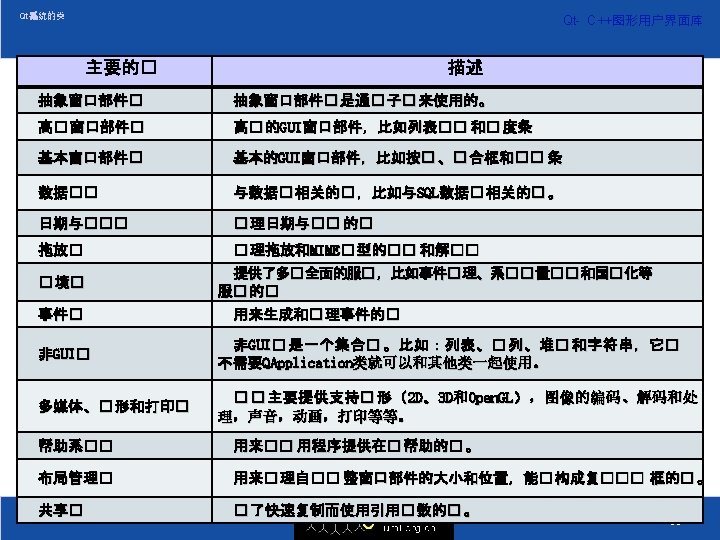 Qt系统构造 库 描述 Qt. Core Qt. Gui 核心非GUI功能 核心GUI功能 Qt. Network Qt. Open. GL 网络模块 Open. GL 模块 SQL 模块 Qt. Sql Qt. Svg Qt. Xml Qt 3 Support QAx. Container QAx. Server Qt. Assistant Qt. Designer Qt. Ui. Tools Qt. Test SVG 透视图类 XML 模块 支持Qt 3的类 Active. Qt 客户端的扩充 Active. Qt 服务器段的扩充 Qt助手的语言类 Qt设计器的扩展类 生成动态GUI类 单元测试 具类 18