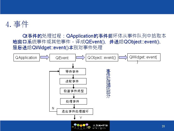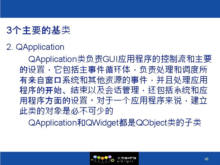 QObject类(二) //构造初始化一个Mandelbrot对象 Mandelbrot: : Mandelbrot(QObject *parent=0, const char *name) : QObject(parent, name) { connect(&timer, SIGNAL(timeout()), SLOT(calculate())); …… { 48