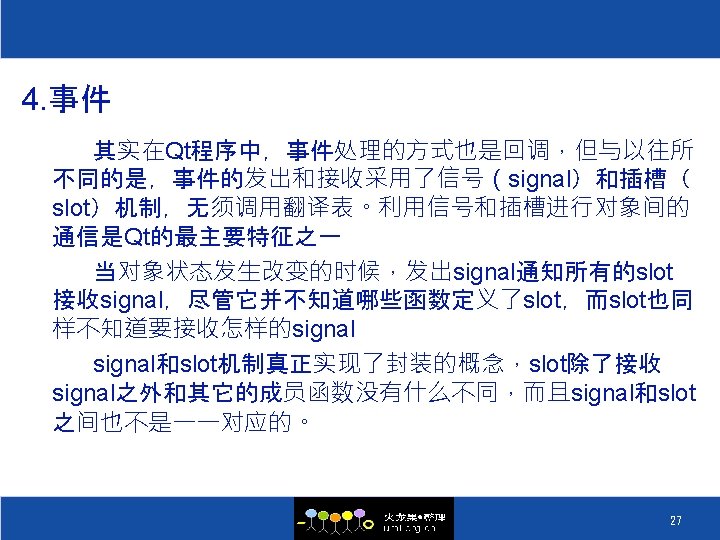 Signal和Slot的声明(一) 在Qt程序设计中,凡是包含signal和slot的类中都要加上 Q_OBJECT的定义,下面的例子给出了如何在一个类中定义 signal和slot: class Student : public QObject { Q_OBJECT public: Student() { my. Mark = 0; } int mark() const { return my. Mark; } public slots: void set. Mark(int new. Mark); signals: void mark. Changed(int new. Mark); private: int my. Mark; }; 28