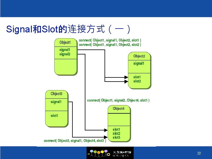 Signal和Slot的连接(二) 在使用connect()函数进行来接的时候,还需要用 到SIGNAL()和SLOT()这两个宏,使用方法如下: QLabel *label = new QLabel; QScroll. Bar *scroll = new QScroll. Bar; QObject: : connect( scroll, SIGNAL(value. Changed(int)), label, SLOT(set. Num(int)) ); 31