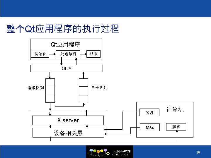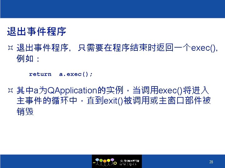 Signal和Slot的连接方式(三) ³ 一个信号连接到另一个信号 connect(line. Edit, SIGNAL(text. Changed(const QString &)), this, SIGNAL(update. Record(const QString &))); ³ 取消一个连接 disconnect(lcd, SIGNAL(overflow()), this, SLOT(handle. Math. Error())); ³ 取消一个连接不是很常用,因为Qt会在一个对象被 删除后自动取消这个对象所包含的所有的连接 34