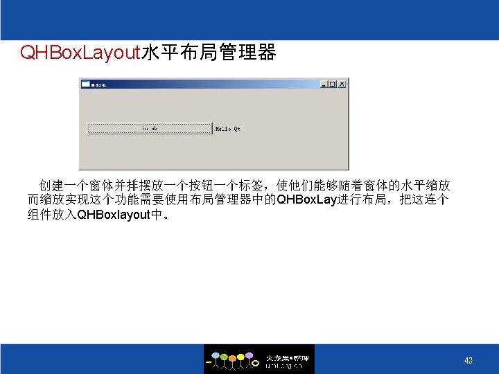 基本布局(2) QHBox. Layout *layout = new QHBox. Layout; layout->add. Widget(spin. Box); layout->add. Widget(slider); QHBox. Layout 水平布局管 理器 QWidget *window = new QWidget; window->set. Window. Title("Enter Your Age"); window->set. Layout(layout); window->show(); return app. exec(); } 42