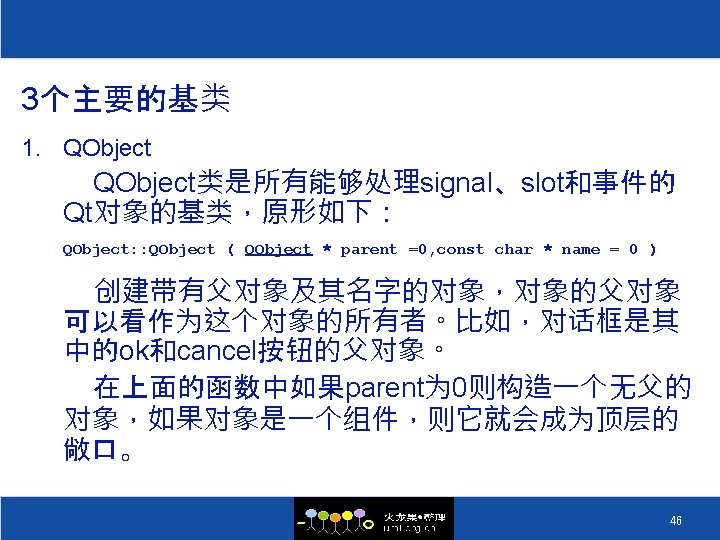 一个完整的Qt程序 1 #include <qapplication. h> 2 #include <qlabel. h> 3 int main(int argc, char **argv) 4 { 5 QApplication app (argc, argv); 6 QLabel *hello = new QLabel("Hello Qt/Embedded!", 0); 7 app. set. Main. Widget(hello); 8 hello->show(); 9 return app. exec(); 10 } 45