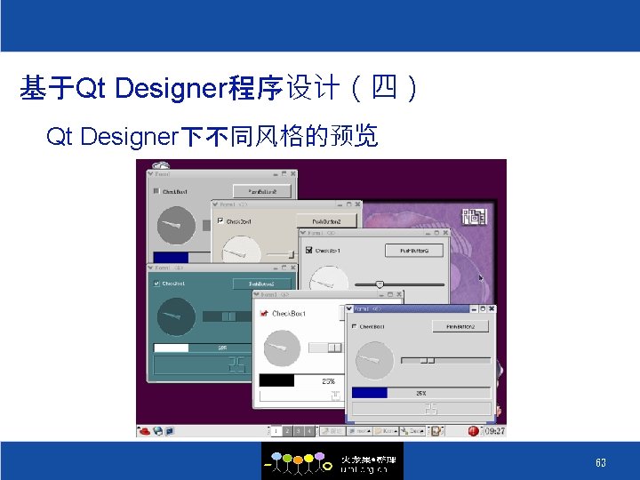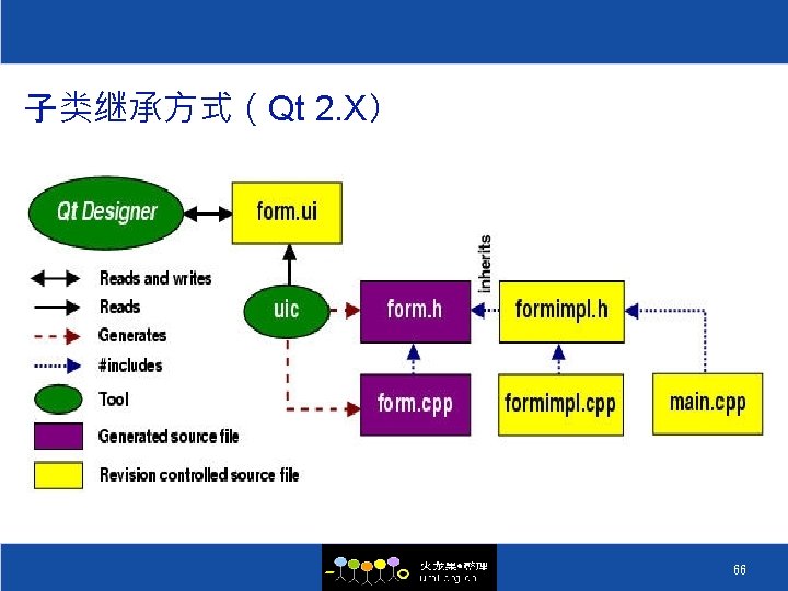 Qt Designer的 作过程 ³ Qt Designer将 程文件组织成. ui的文件 ³ 由. ui文件生成. cpp 和. h文件 ². ui -----xml ² uic ³ 生成moc_filenaem. cpp ² moc 64