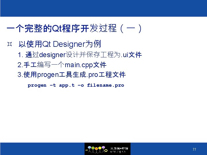 一个完整的Qt程序开发过程(二) 4. 指定tmake路径 ± 本机编译 TMAKEPATH=/tmake的安装路径(如$TMAKEDIR)/lib/qws/linuxx 86 -g++ ± 交叉编译 TMAKEPATH=/tmake的安装路径(如$TMAKEDIR)/lib/qws/linuxarm-g++ 5. 通过tmake自动生成Makefile文件 tmake –o Makefilename. pro 6. make生成可执行文件 78