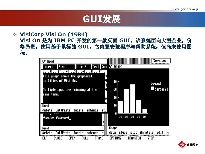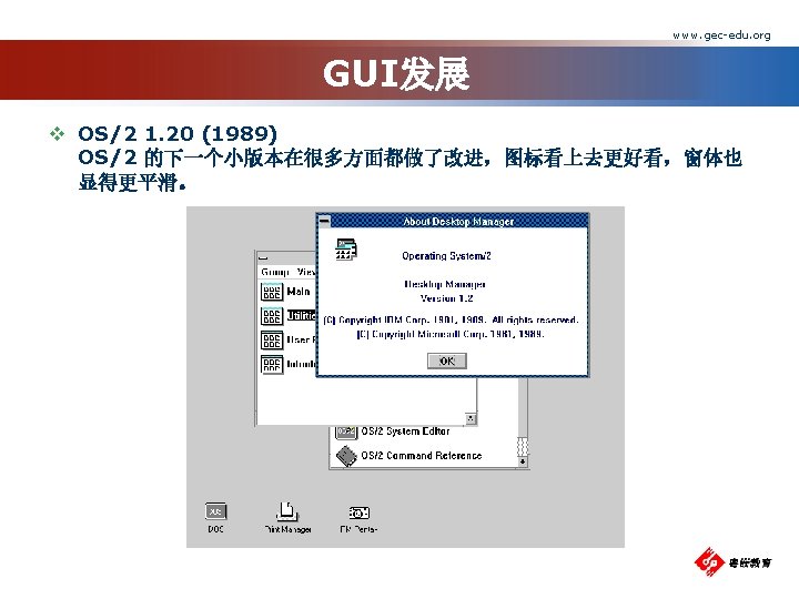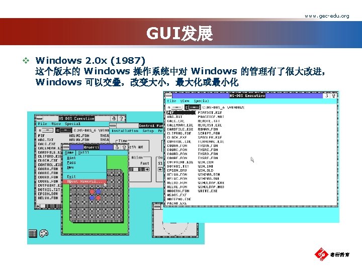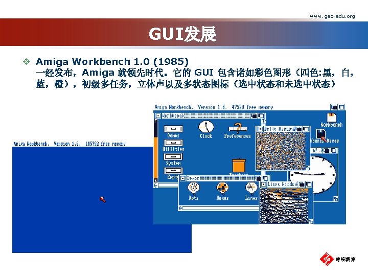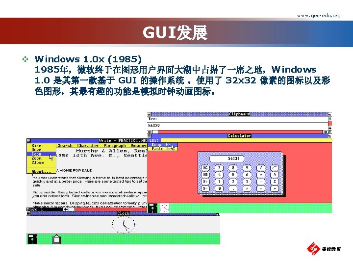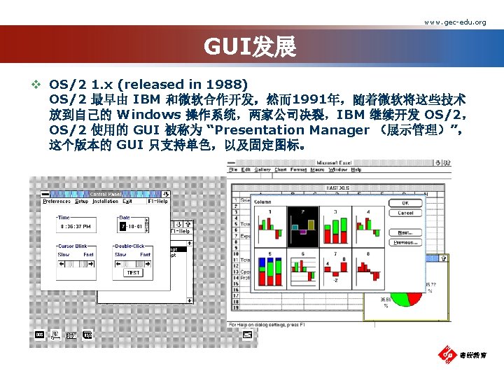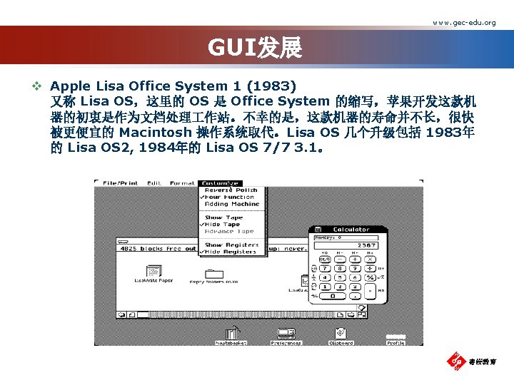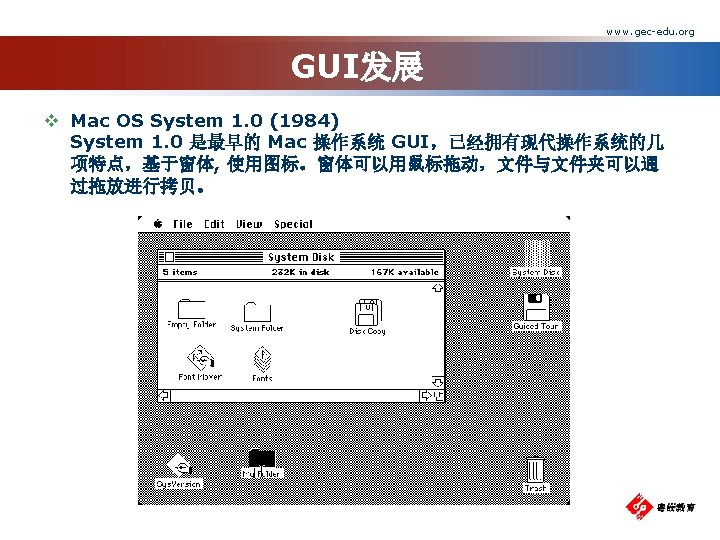 www. gec-edu. org GUI发展 v Mac OS System 7 (released in 1991) Mac OS 7 是第一款支持彩色的 GUI,图标中加入了微妙的灰,蓝,黄阴影。