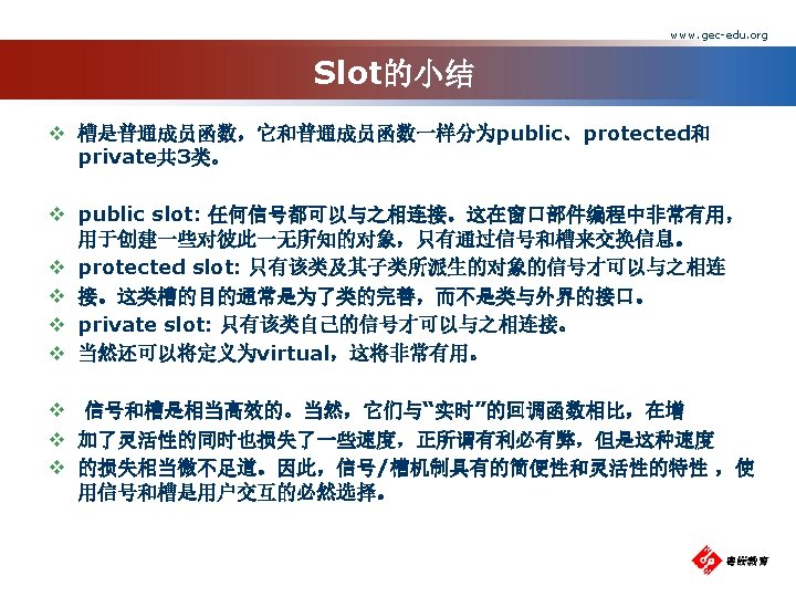 www. gec-edu. org 信号和槽的声明 v 信号与槽的声明也是在头文件中进行的。 v 例如,下面声明了三个信号: v signals: void mysignals(); void mysignals(int x,int y); v 例如,下面声明了三个槽: v public slots: v void my. Slot(); void my. Slot(int x); void my. Signal. Param(int x, int y);